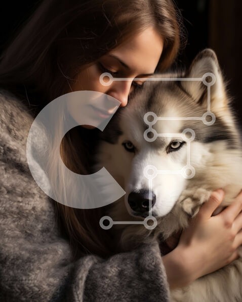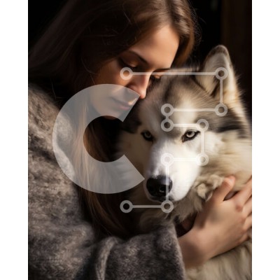 Υπάρχει δυνατότητα προσωποποίησης με δική σας φωτογραφία και προσαρμογής διαστάσεων κατόπιν παραγγελίας. Το συγεκεριμενο Puzzle 10x10 cm – 25 κομμ παρουσιαζει Αυτή η εικόνα απεικονίζει μια νεαρή γυναίκα να στέκεται μπροστά σε ένα σκούρο φόντο, αγκαλιάζοντας έναν μεγάλο λευκό σκύλο γεροδεμένο. Η γυναίκα έχει μακριά, ίσια καστανά μαλλιά και φοράει ένα γκρι πουλόβερ. Ο γεροδεμένος σκύλος έχει ένα χον