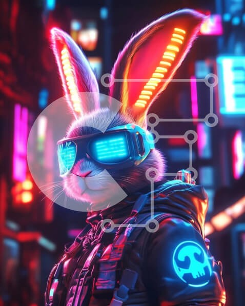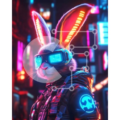 Υπάρχει δυνατότητα προσωποποίησης με δική σας φωτογραφία και προσαρμογής διαστάσεων κατόπιν παραγγελίας. Το συγεκεριμενο Puzzle 10x10 cm – 25 κομμ παρουσιαζει Η εικόνα απεικονίζει ένα φουτουριστικό, ανθρωπόμορφο κουνέλι που φοράει μεγάλα γυαλιά νέον και ένα μαύρο τακτικό σακάκι. Τα μεγάλα αυτιά του φωτίζονται με πολύχρωμα φώτα, σε αντίθεση με ένα σκοτεινό, ζωντανό αστικό σκηνικό γεμάτο με φώτα νέο