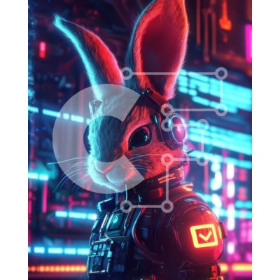 Υπάρχει δυνατότητα προσωποποίησης με δική σας φωτογραφία και προσαρμογής διαστάσεων κατόπιν παραγγελίας. Το συγεκεριμενο Puzzle 10x10 cm – 25 κομμ παρουσιαζει Η εικόνα απεικονίζει ένα φουτουριστικό κουνέλι με μεγάλα αυτιά, φορώντας ακουστικά υψηλής τεχνολογίας και ένα κομψό, θωρακισμένο κοστούμι. Το φόντο είναι γεμάτο με ζωντανά φώτα νέον που δημιουργούν μια ψηφιακή ατμόσφαιρα, υποδηλώνοντας ένα θ