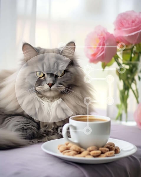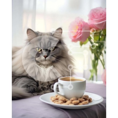 Υπάρχει δυνατότητα προσωποποίησης με δική σας φωτογραφία και προσαρμογής διαστάσεων κατόπιν παραγγελίας. Το συγεκεριμενο Puzzle 10x10 cm – 25 κομμ παρουσιαζει Η εικόνα δείχνει μια γκρίζα γάτα να κάθεται στο περβάζι του παραθύρου δίπλα σε δύο φλιτζάνια καφέ και μερικά μπισκότα. Υπάρχουν επίσης πολλά ροζ τριαντάφυλλα στο βάθος, υποδηλώνοντας ότι η γάτα μπορεί να απολαμβάνει το γεύμα της σε εξωτερικο