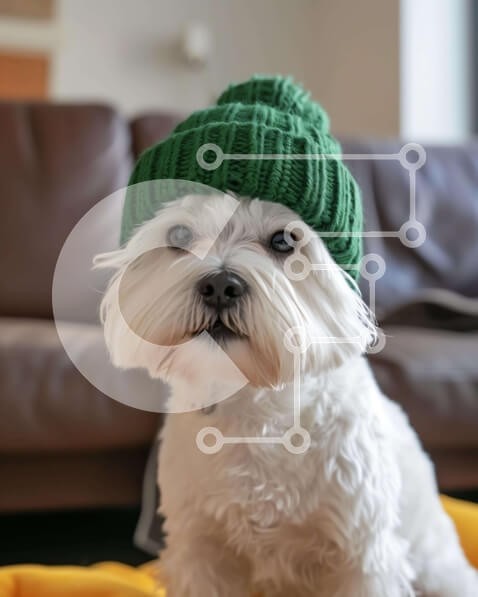 Υπάρχει δυνατότητα προσωποποίησης με δική σας φωτογραφία και προσαρμογής διαστάσεων κατόπιν παραγγελίας. Το συγεκεριμενο Puzzle 10x10 cm – 25 κομμ παρουσιαζει Αυτή η εικόνα παρουσιάζει ένα μικρό, λευκό σκυλί που φοράει ένα εντυπωσιακό πράσινο πλεκτό φασόλι. Ο σκύλος κάθεται στον καναπέ με το κεφάλι του να γέρνει ελαφρά στο πλάι, φαίνεται χαλαρός και άνετος καθώς φοράει το καπέλο. Ένα μοναδικό Puz