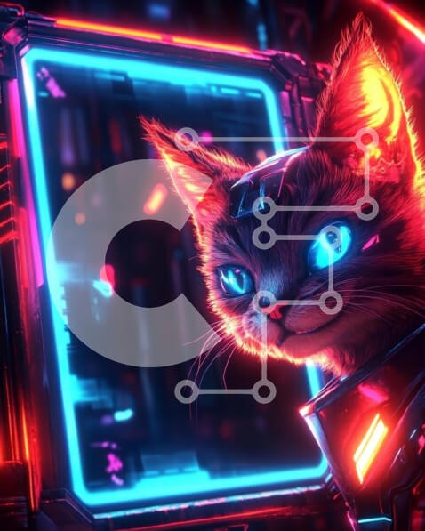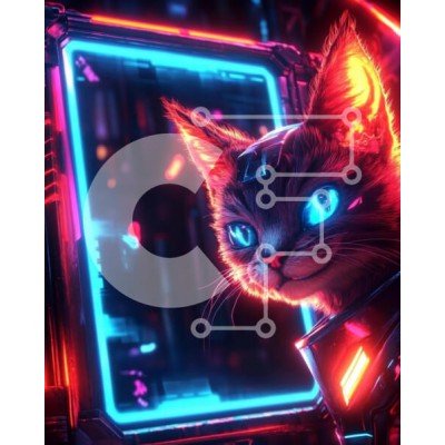 Υπάρχει δυνατότητα προσωποποίησης με δική σας φωτογραφία και προσαρμογής διαστάσεων κατόπιν παραγγελίας. Το συγεκεριμενο Puzzle 10x10 cm – 25 κομμ παρουσιαζει Αυτή η εικόνα παρουσιάζει μια φουτουριστική γάτα με λαμπερά μπλε μάτια και ένα μεταλλικό ακουστικό, σε ένα ζωντανό νέον φόντο από μπλε και ροζ φώτα. Η γάτα έχει μια παιχνιδιάρικη έκφραση και η γούνα της τονίζεται από τον πολύχρωμο φωτισμό. Η