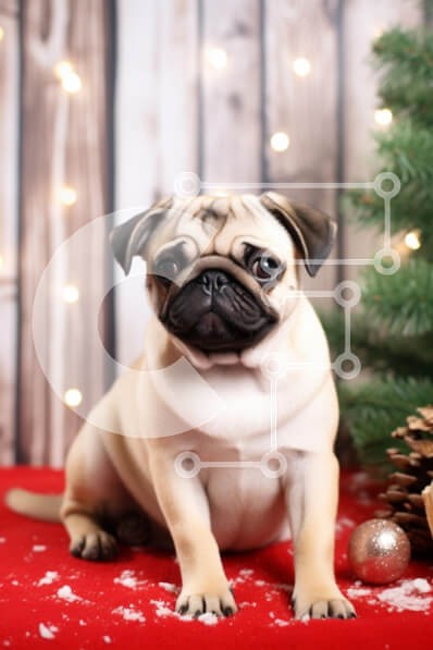 Υπάρχει δυνατότητα προσωποποίησης με δική σας φωτογραφία και προσαρμογής διαστάσεων κατόπιν παραγγελίας. Το συγεκεριμενο Puzzle 10x10 cm – 25 κομμ παρουσιαζει Αυτή η εικόνα παρουσιάζει ένα χαριτωμένο σκυλί πατημασιά που κάθεται σε μια κόκκινη κουβέρτα στολισμένη με διακοσμητικά που μοιάζουν με χιόνι. Το πατημασιά έχει ένα χαρακτηριστικό παλτό ελαφιού με σκούρα σημάδια στο πρόσωπό του. Πίσω από την