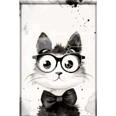 Υπάρχει δυνατότητα προσωποποίησης με δική σας φωτογραφία και προσαρμογής διαστάσεων κατόπιν παραγγελίας. Το συγεκεριμενο Puzzle 10x10 cm – 25 κομμ παρουσιαζει Αυτή η εικόνα παρουσιάζει μια κομψή ασπρόμαυρη γάτα που φοράει γυαλιά και ένα παπιγιόν. Η γάτα είναι τοποθετημένη στο κέντρο του πλαισίου, με το κεφάλι της να γέρνει ελαφρά. Στο βάθος, υπάρχουν καλλιτεχνικές πιτσιλιές μπογιάς στον τοίχο, προ