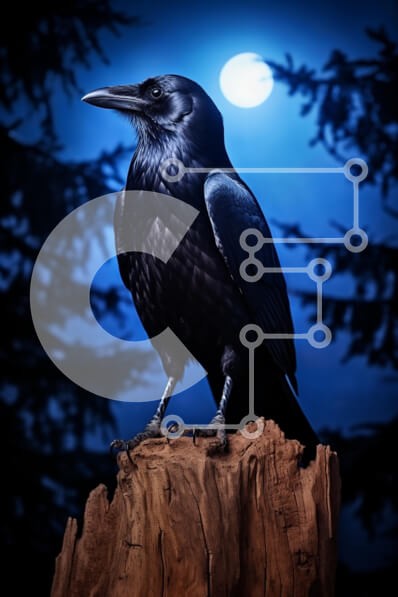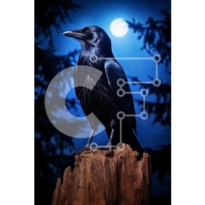Υπάρχει δυνατότητα προσωποποίησης με δική σας φωτογραφία και προσαρμογής διαστάσεων κατόπιν παραγγελίας. Το συγεκεριμενο Puzzle 10x10 cm – 25 κομμ παρουσιαζει Η εικόνα παρουσιάζει ένα μεγαλοπρεπές κοράκι σκαρφαλωμένο σε ένα ξεπερασμένο κούτσουρο, με φόντο ένα μυστικιστικό μπλε φόντο που φωτίζεται από μια φωτεινή πανσέληνο. Τα γυαλιστερά μαύρα φτερά του κορακιού αντανακλούν τις αποχρώσεις του μπλε,