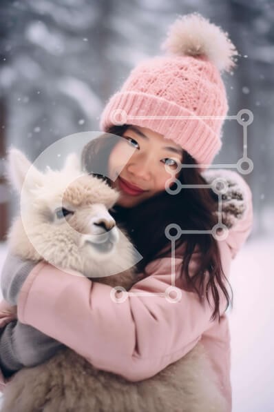 Υπάρχει δυνατότητα προσωποποίησης με δική σας φωτογραφία και προσαρμογής διαστάσεων κατόπιν παραγγελίας. Το συγεκεριμενο Puzzle 10x10 cm – 25 κομμ παρουσιαζει Αυτή η εικόνα δείχνει μια νεαρή γυναίκα ντυμένη στα ροζ, να αγκαλιάζει μια λάμα στο χιόνι. Τα μάτια της κοπέλας είναι κλειστά, υποδηλώνοντας τη στοργή της προς το ζώο. Το χιονισμένο τοπίο προσθέτει στη γαλήνια ατμόσφαιρα της σκηνής, τονίζοντ