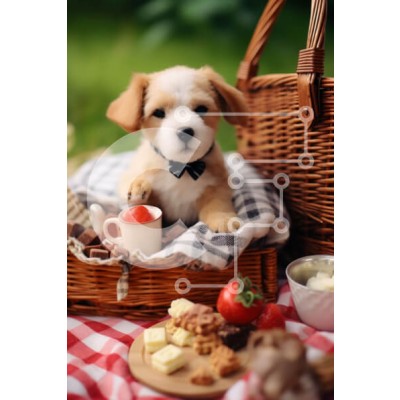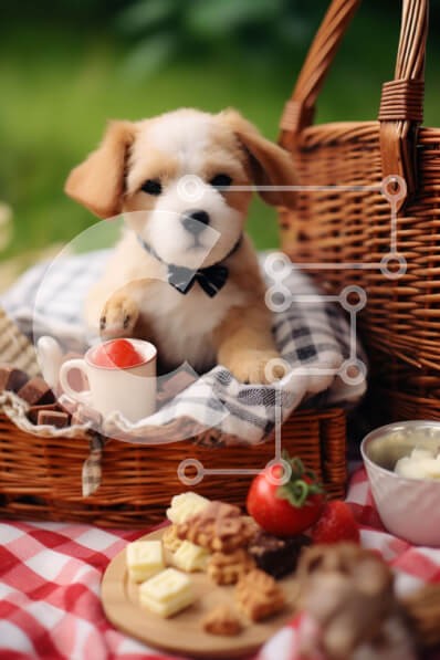 Υπάρχει δυνατότητα προσωποποίησης με δική σας φωτογραφία και προσαρμογής διαστάσεων κατόπιν παραγγελίας. Το συγεκεριμενο Puzzle 10x10 cm – 25 κομμ παρουσιαζει Αυτή η εικόνα παρουσιάζει έναν μικρό, καφέ σκύλο που κάθεται στη μέση ενός υπαίθριου καλαθιού για πικνίκ γεμάτο με διάφορα σνακ και είδη διατροφής. Ο σκύλος κοιτάζει την κάμερα, υπονοώντας ότι απολαμβάνει το γεύμα. Επιπλέον, υπάρχουν πολλά κ
