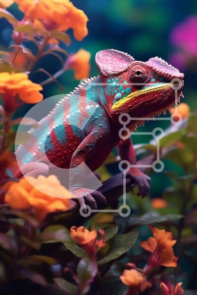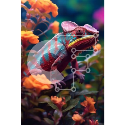 Υπάρχει δυνατότητα προσωποποίησης με δική σας φωτογραφία και προσαρμογής διαστάσεων κατόπιν παραγγελίας. Το συγεκεριμενο Puzzle 10x10 cm – 25 κομμ παρουσιαζει Αυτή η εικόνα παρουσιάζει έναν πολύχρωμο χαμαιλέοντα που κάθεται σε ένα κλαδί με λουλούδια στο φόντο. Τα ζωηρά χρώματα του χαμαιλέοντα τον κάνουν να ξεχωρίζει στο πράσινο φύλλωμα και τα λουλούδια προσθέτουν ένα ποπ χρώμα στη σκηνή. Ένα μονα