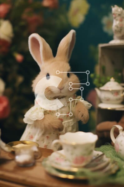 Υπάρχει δυνατότητα προσωποποίησης με δική σας φωτογραφία και προσαρμογής διαστάσεων κατόπιν παραγγελίας. Το συγεκεριμενο Puzzle 10x10 cm – 25 κομμ παρουσιαζει Αυτή η εικόνα παρουσιάζει ένα γοητευτικό κουνελάκι που κάθεται σε ένα τραπέζι και απολαμβάνει ένα πάρτι τσαγιού. Το τραπέζι είναι διακοσμημένο με πολλά φλιτζάνια, πιάτα και άλλα αντικείμενα, δημιουργώντας μια απολαυστική και ιδιότροπη ατμόσφ