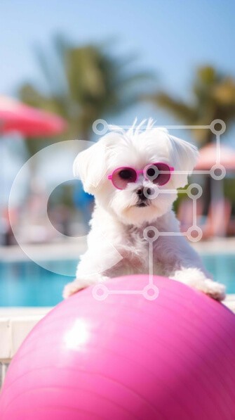 Υπάρχει δυνατότητα προσωποποίησης με δική σας φωτογραφία και προσαρμογής διαστάσεων κατόπιν παραγγελίας. Το συγεκεριμενο Puzzle 10x10 cm – 25 κομμ παρουσιαζει Η εικόνα δείχνει ένα μικρό λευκό σκυλί που φοράει γυαλιά ηλίου και κάθεται πάνω από μια φουσκωτή ροζ μπάλα στην πισίνα. Ο σκύλος φαίνεται να απολαμβάνει τον ελεύθερο χρόνο του κοιτάζοντας το νερό. Αρκετές ομπρέλες στο φόντο υποδηλώνουν υπαίθ
