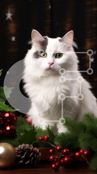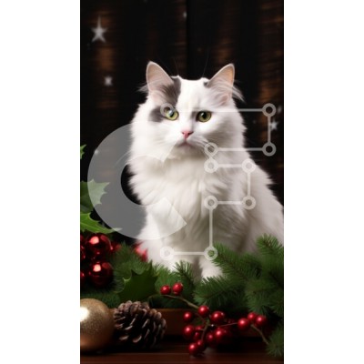 Υπάρχει δυνατότητα προσωποποίησης με δική σας φωτογραφία και προσαρμογής διαστάσεων κατόπιν παραγγελίας. Το συγεκεριμενο Puzzle 10x10 cm – 25 κομμ παρουσιαζει Η εικόνα απεικονίζει μια χνουδωτή λευκή γάτα με εντυπωσιακά πράσινα μάτια, που κάθεται με χάρη ανάμεσα σε εορταστικές διακοσμήσεις, όπως κλαδιά πεύκου, κόκκινα μούρα και λαμπερά στολίδια. Η απαλή γούνα της γάτας έρχεται σε υπέροχη αντίθεση μ
