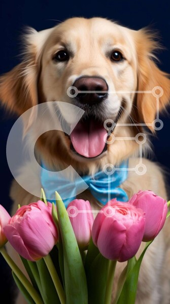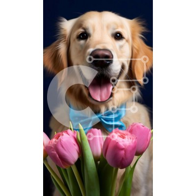 Υπάρχει δυνατότητα προσωποποίησης με δική σας φωτογραφία και προσαρμογής διαστάσεων κατόπιν παραγγελίας. Το συγεκεριμενο Puzzle 10x10 cm – 25 κομμ παρουσιαζει Αυτή η εικόνα παρουσιάζει ένα χρυσό ριτρίβερ που κρατά ροζ τουλίπες στο στόμα του. Ο σκύλος χαμογελά και φαίνεται να απολαμβάνει τα λουλούδια, τα οποία είναι τοποθετημένα μπροστά του. Υπάρχει επίσης ένας πορτοκαλί φιόγκος δεμένος στο λαιμό τ
