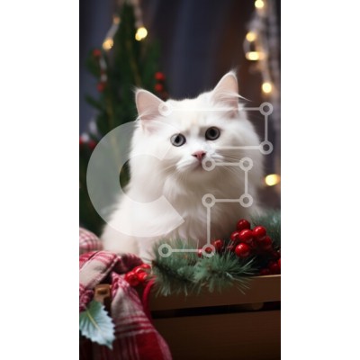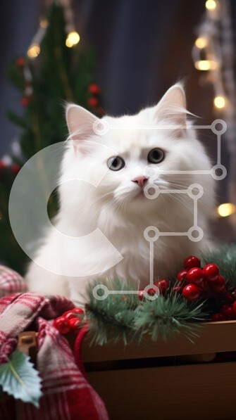 Υπάρχει δυνατότητα προσωποποίησης με δική σας φωτογραφία και προσαρμογής διαστάσεων κατόπιν παραγγελίας. Το συγεκεριμενο Puzzle 10x10 cm – 25 κομμ παρουσιαζει Αυτή η εικόνα παρουσιάζει μια χνουδωτή λευκή γάτα με εντυπωσιακά μπλε μάτια, που κάθεται ανάμεσα σε γιορτινή διακόσμηση. Η γάτα περιβάλλεται από εορταστικές γιρλάντες και έντονα κόκκινα μούρα, δημιουργώντας μια ζεστή και χαρούμενη ατμόσφαιρα