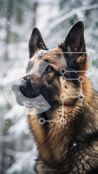 Υπάρχει δυνατότητα προσωποποίησης με δική σας φωτογραφία και προσαρμογής διαστάσεων κατόπιν παραγγελίας. Το συγεκεριμενο Puzzle 10x10 cm – 25 κομμ παρουσιαζει Αυτή η εικόνα παρουσιάζει έναν Γερμανικό Ποιμενικό σκύλο που στέκεται σε ένα χιονισμένο δάσος. Ο σκύλος έχει ένα καφέ και μαύρο τρίχωμα, με καφέ μύτη και καστανά μάτια. Έχει μια σοβαρή έκφραση και κοιτάζει ευθεία, με τα αυτιά ψηλά. Το φόντο