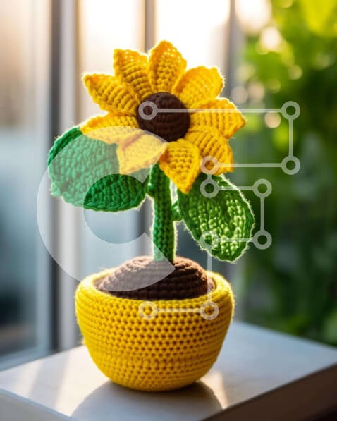 Υπάρχει δυνατότητα προσωποποίησης με δική σας φωτογραφία και προσαρμογής διαστάσεων κατόπιν παραγγελίας. Το συγεκεριμενο puzzle παρουσιαζει Η εικόνα απεικονίζει μια ζαρντινιέρα ηλίανθου με κροσέ, η οποία φαίνεται να κάθεται πάνω από το περβάζι του παραθύρου. Η γλάστρα είναι κατασκευασμένη από κίτρινο νήμα και το λουλούδι φαίνεται να μεγαλώνει από αυτό. Μπορεί να έχει τοποθετηθεί εκεί από κάποιον ή ως μέρος μιας συ