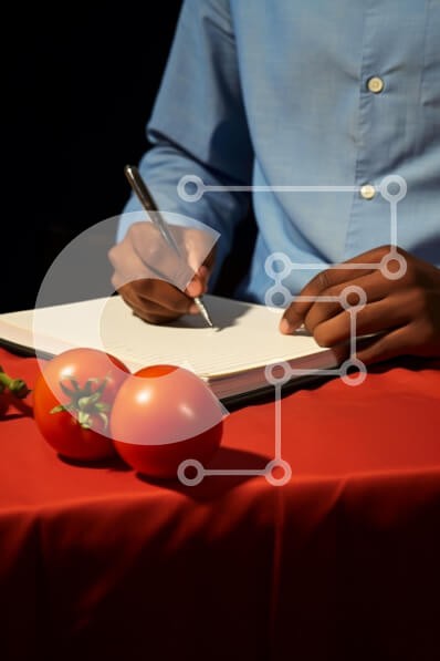 Υπάρχει δυνατότητα προσωποποίησης με δική σας φωτογραφία και προσαρμογής διαστάσεων κατόπιν παραγγελίας. Το συγεκεριμενο puzzle παρουσιαζει Η εικόνα δείχνει έναν άνδρα να γράφει σε χαρτί μπροστά από δύο ντομάτες, με ένα σημειωματάριο και ένα στυλό ή μολύβι κοντά. Γύρω από τη σκηνή υπάρχουν πολλά φυτά τομάτας, υποδεικνύοντας ένα πιθανό έργο κηπουρικής. Ένα μοναδικό puzzle που συνδυάζει ποιότητα, αισθητική και εμπε