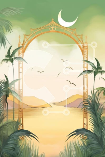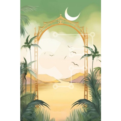 Υπάρχει δυνατότητα προσωποποίησης με δική σας φωτογραφία και προσαρμογής διαστάσεων κατόπιν παραγγελίας. Το συγεκεριμενο puzzle παρουσιαζει Η εικόνα παρουσιάζει μια αψίδα με ένα μισοφέγγαρο και φοίνικες στο πρώτο πλάνο. Πουλιά πετούν τριγύρω, προσθέτοντας στη φανταστική ατμόσφαιρα. Υπάρχει επίσης νερό που περιβάλλει το πλαίσιο, υποδηλώνοντας μια παράκτια ή ωκεάνια τοποθεσία. Ένα μοναδικό puzzle που συνδυάζει ποιό