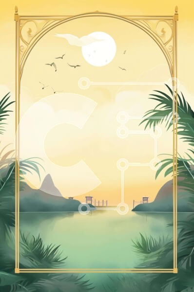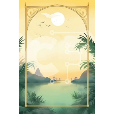 Υπάρχει δυνατότητα προσωποποίησης με δική σας φωτογραφία και προσαρμογής διαστάσεων κατόπιν παραγγελίας. Το συγεκεριμενο puzzle παρουσιαζει Αυτή η εικόνα παρουσιάζει ένα περίτεχνο χρυσό πλαίσιο που περιβάλλεται από φοίνικες και νερό. Πουλιά πετούν γύρω από το κάδρο σε πρώτο πλάνο, δημιουργώντας ένα γαλήνιο και ειδυλλιακό σκηνικό. Είναι ιδανικό για την απεικόνιση τροπικών τοπίων, καθώς και σκηνών της φύσης όπως παρ