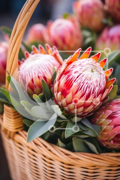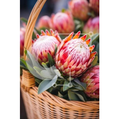 Υπάρχει δυνατότητα προσωποποίησης με δική σας φωτογραφία και προσαρμογής διαστάσεων κατόπιν παραγγελίας. Το συγεκεριμενο puzzle παρουσιαζει Η εικόνα δείχνει ένα ψάθινο καλάθι γεμάτο με κόκκινα και λευκά λουλούδια πρωτέας. Τα ζωηρά χρώματα των λουλουδιών δημιουργούν μια μαγευτική εμφάνιση στο καλάθι, το οποίο πιθανότατα προορίζεται για πώληση. Είτε φρέσκα είτε αποξηραμένα, αυτά τα όμορφα λουλούδια προσθέτουν μια πι