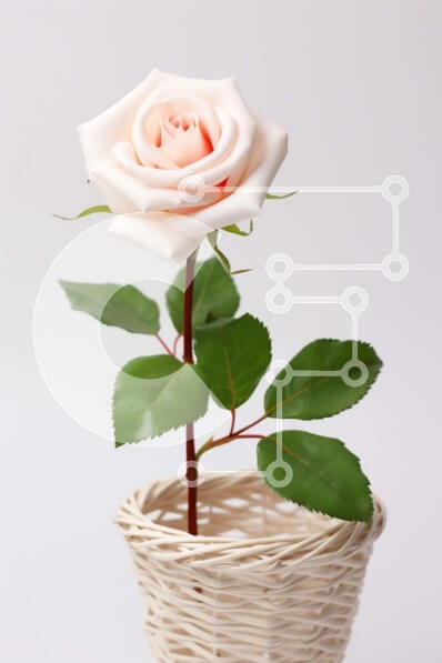 Υπάρχει δυνατότητα προσωποποίησης με δική σας φωτογραφία και προσαρμογής διαστάσεων κατόπιν παραγγελίας. Το συγεκεριμενο puzzle παρουσιαζει Αυτή η εικόνα παρουσιάζει ένα λευκό ψάθινο καλάθι με ένα ροζ τριαντάφυλλο να φύεται από αυτό. Το τριαντάφυλλο τοποθετείται στη μέση του καλαθιού και περιβάλλεται από πολλά φύλλα, υποδεικνύοντας ότι έχει φροντιστεί καλά. Η διάταξη δημιουργεί μια οπτικά ευχάριστη και ήρεμη σκηνή