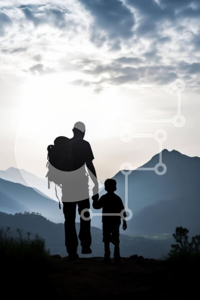 Υπάρχει δυνατότητα προσωποποίησης με δική σας φωτογραφία και προσαρμογής διαστάσεων κατόπιν παραγγελίας. Το συγεκεριμενο puzzle παρουσιαζει Αυτή η εικόνα απαθανατίζει έναν άνδρα και ένα παιδί με σιλουέτα με φόντο τα βουνά καθώς περπατούν χέρι-χέρι. Η σκηνή υποδηλώνει μια αίσθηση περιπέτειας και εξερεύνησης, με ένα άλλο άτομο να φαίνεται στο βάθος. Ένα μοναδικό puzzle που συνδυάζει ποιότητα, αισθητική και εμπειρία
