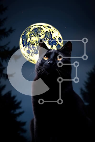 Υπάρχει δυνατότητα προσωποποίησης με δική σας φωτογραφία και προσαρμογής διαστάσεων κατόπιν παραγγελίας. Το συγεκεριμενο puzzle παρουσιαζει Αυτή η εικόνα παρουσιάζει μια μαύρη γάτα που κάθεται μπροστά σε μια πανσέληνο, με δέντρα στο φόντο. Η γάτα είναι σκιαγραφημένη στο φεγγάρι, δημιουργώντας μια μυστηριώδη και σαγηνευτική σκηνή. Τα δέντρα προσθέτουν στην απόκοσμη ατμόσφαιρα της εικόνας. Ένα μοναδικό puzzle που σ