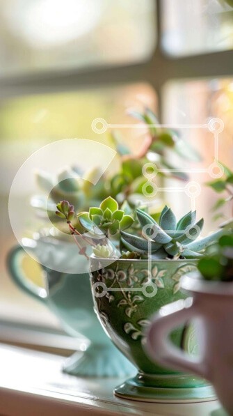 Υπάρχει δυνατότητα προσωποποίησης με δική σας φωτογραφία και προσαρμογής διαστάσεων κατόπιν παραγγελίας. Το συγεκεριμενο puzzle παρουσιαζει Η εικόνα απεικονίζει ένα περβάζι παραθύρου με πολλά χυμώδη φυτά σε γλάστρες σε διαφορετικά κύπελλα. Υπάρχουν τρία πράσινα, μπλε και λευκά κύπελλα στο περβάζι, τα οποία είναι όλα γεμάτα με παχύφυτα. Μερικά από τα φυτά φαίνεται να είναι μεγαλύτερα από άλλα, υποδηλώνοντας ότι μπο