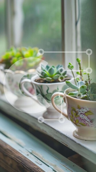 Υπάρχει δυνατότητα προσωποποίησης με δική σας φωτογραφία και προσαρμογής διαστάσεων κατόπιν παραγγελίας. Το συγεκεριμενο puzzle παρουσιαζει Η εικόνα δείχνει ένα περβάζι παραθύρου με πέντε κεραμικά κύπελλα τοποθετημένα στη σειρά. Κάθε φλιτζάνι περιέχει διάφορους τύπους φυτών, συμπεριλαμβανομένων των παχύφυτων που είτε φυτεύονται είτε αναπτύσσονται έξω από τα κύπελλα. Η σκηνή μεταδίδει μια αίσθηση εσωτερικής κηπουρι