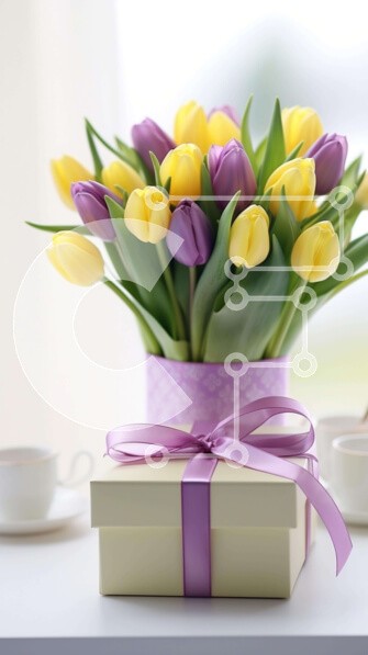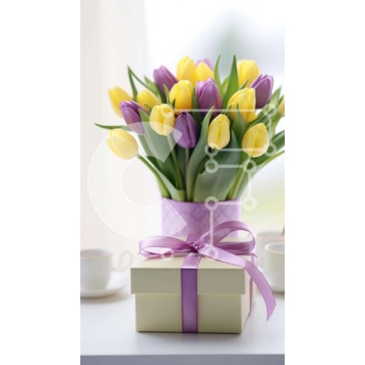Υπάρχει δυνατότητα προσωποποίησης με δική σας φωτογραφία και προσαρμογής διαστάσεων κατόπιν παραγγελίας. Το συγεκεριμενο puzzle παρουσιαζει Αυτή η εικόνα απεικονίζει ένα μπουκέτο από κίτρινες και μοβ τουλίπες σε ένα κομψό βάζο, με ένα κουτί δώρου και πολλά φλιτζάνια και κούπες στο τραπέζι. Τα λουλούδια είναι φρέσκα και καλοδιατηρημένα, υποδηλώνοντας ότι έχουν μαζευτεί πρόσφατα για την περίσταση. Ένα μοναδικό puzz