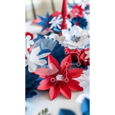 Υπάρχει δυνατότητα προσωποποίησης με δική σας φωτογραφία και προσαρμογής διαστάσεων κατόπιν παραγγελίας. Το συγεκεριμενο puzzle παρουσιαζει Η εικόνα παρουσιάζει μια διάταξη από κόκκινα, λευκά και μπλε χάρτινα λουλούδια σε ένα τραπέζι. Περιλαμβάνονται διάφοροι τύποι λουλουδιών, όπως τριαντάφυλλα, γαρίφαλα, λουλούδια που μοιάζουν με μαργαρίτα και λουλούδια σε σχήμα αστεριού, μερικά χειροποίητα και άλλα προκατασκευασ