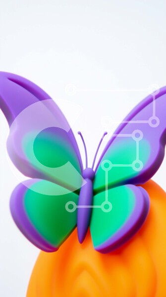 Υπάρχει δυνατότητα προσωποποίησης με δική σας φωτογραφία και προσαρμογής διαστάσεων κατόπιν παραγγελίας. Το συγεκεριμενο puzzle παρουσιαζει Αυτή η εικόνα παρουσιάζει μια μωβ και πράσινη πεταλούδα που κάθεται πάνω από ένα πορτοκαλί αντικείμενο. Η πεταλούδα φαίνεται να δημιουργείται χρησιμοποιώντας λογισμικό τρισδιάστατης μοντελοποίησης, επιδεικνύοντας τις περίπλοκες λεπτομέρειες και τα ζωηρά χρώματά της. Στην εικόν
