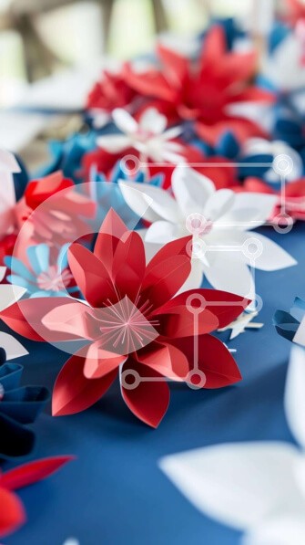 Υπάρχει δυνατότητα προσωποποίησης με δική σας φωτογραφία και προσαρμογής διαστάσεων κατόπιν παραγγελίας. Το συγεκεριμενο puzzle παρουσιαζει Η εικόνα δείχνει ένα τραπέζι στολισμένο με κόκκινα, λευκά και μπλε χάρτινα λουλούδια διαφόρων τύπων όπως τριαντάφυλλα, γαρίφαλα και μαργαρίτες. Μερικά λουλούδια κρέμονται από την οροφή, ενώ άλλα επιπλέουν στον αέρα, δημιουργώντας μια ιδιότροπη εμφάνιση. Ένα μοναδικό puzzle πο