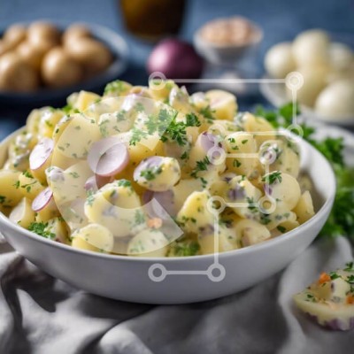 Υπάρχει δυνατότητα προσωποποίησης με δική σας φωτογραφία και προσαρμογής διαστάσεων κατόπιν παραγγελίας. Το συγεκεριμενο puzzle παρουσιαζει Αυτή η εικόνα παρουσιάζει ένα λευκό μπολ γεμάτο με πατατοσαλάτα, γαρνιρισμένο με μαϊντανό και πατάτες. Τοποθετείται δίπλα σε πολλά άλλα αντικείμενα στο τραπέζι, όπως σκεύη, πιάτα και φλιτζάνια. Αυτά τα αντικείμενα θα μπορούσαν να χρησιμοποιηθούν για την προετοιμασία του πιάτου