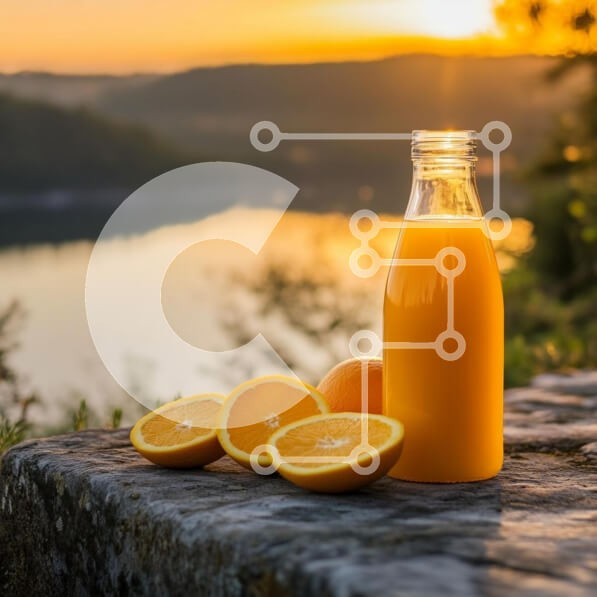 Υπάρχει δυνατότητα προσωποποίησης με δική σας φωτογραφία και προσαρμογής διαστάσεων κατόπιν παραγγελίας. Το συγεκεριμενο puzzle παρουσιαζει Η εικόνα παρουσιάζει ένα μπουκάλι χυμό πορτοκαλιού τοποθετημένο σε μια πέτρινη επιφάνεια με κομμένα πορτοκάλια δίπλα του. Το φόντο δείχνει ένα όμορφο τοπίο το ηλιοβασίλεμα, με τον ήλιο να αντανακλάται από ένα σώμα νερού και δέντρα να πλαισιώνουν τη σκηνή. Τα ζεστά χρώματα του