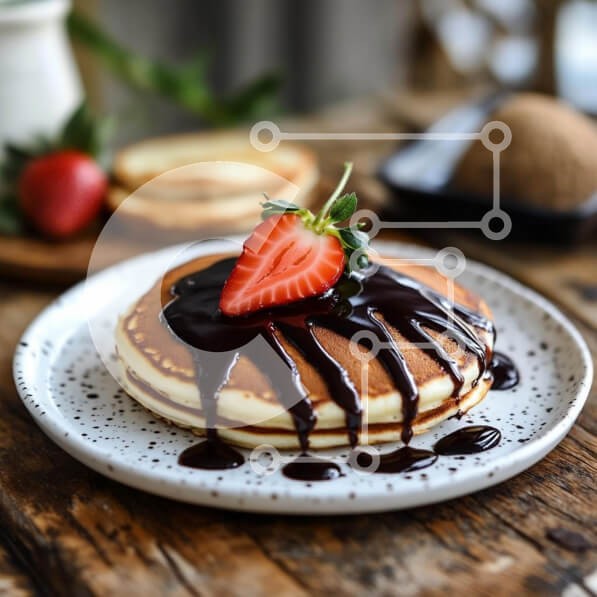 Υπάρχει δυνατότητα προσωποποίησης με δική σας φωτογραφία και προσαρμογής διαστάσεων κατόπιν παραγγελίας. Το συγεκεριμενο puzzle παρουσιαζει Αυτή η εικόνα παρουσιάζει μια στοίβα από αφράτες τηγανίτες περιχυμένες με πλούσια σάλτσα σοκολάτας, με μια φρέσκια φράουλα. Οι τηγανίτες σερβίρονται σε ένα διάστικτο λευκό πιάτο τοποθετημένο σε ένα ρουστίκ ξύλινο τραπέζι, με επιπλέον φράουλες και ένα μπολ με καστανή ζάχαρη στο