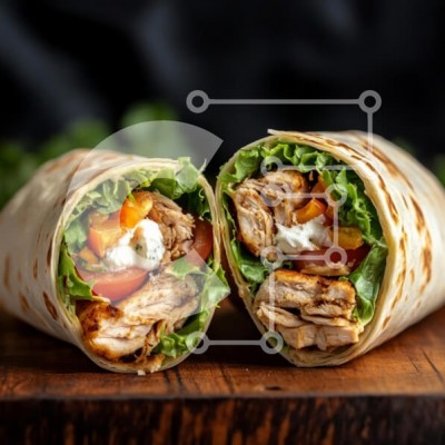 Υπάρχει δυνατότητα προσωποποίησης με δική σας φωτογραφία και προσαρμογής διαστάσεων κατόπιν παραγγελίας. Το συγεκεριμενο puzzle παρουσιαζει Η εικόνα παρουσιάζει δύο υπέροχα περιτυλίγματα κομμένα στη μέση, αποκαλύπτοντας μια πολύχρωμη γέμιση από ψητό κοτόπουλο, φρέσκο μαρούλι, ντομάτες σε κύβους και κρεμώδη σάλτσα. Τα περιτυλίγματα τοποθετούνται όμορφα σε μια ξύλινη σανίδα, αναδεικνύοντας την ελκυστική υφή και τα