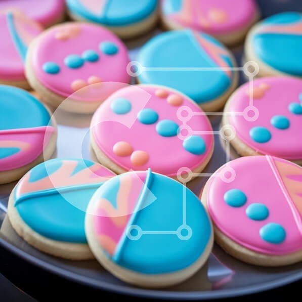 Υπάρχει δυνατότητα προσωποποίησης με δική σας φωτογραφία και προσαρμογής διαστάσεων κατόπιν παραγγελίας. Το συγεκεριμενο puzzle παρουσιαζει Ένας δίσκος με μπισκότα διακοσμημένος με ροζ, μπλε και πορτοκαλί χρώματα. Τα μπισκότα είναι τακτοποιημένα στο δίσκο, το καθένα εμφανίζει μοναδικά σχήματα και μεγέθη. Μικρές κουκκίδες απλώνονται στα μπισκότα, υποδηλώνοντας διακόσμηση χεριών. Ένα μοναδικό puzzle που συνδυάζει π