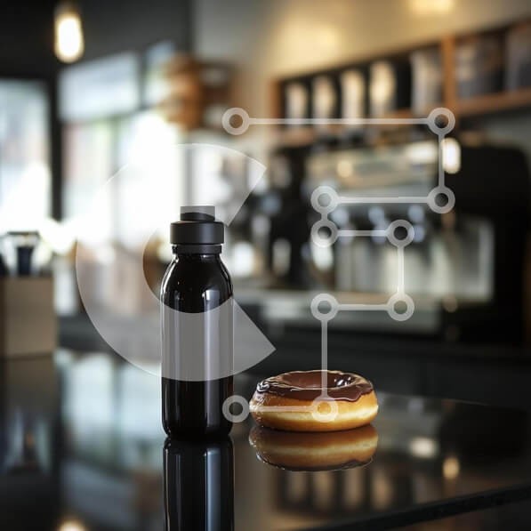 Υπάρχει δυνατότητα προσωποποίησης με δική σας φωτογραφία και προσαρμογής διαστάσεων κατόπιν παραγγελίας. Το συγεκεριμενο puzzle παρουσιαζει Η εικόνα παρουσιάζει ένα κομψό μαύρο μπουκάλι νερού τοποθετημένο σε έναν γυαλιστερό πάγκο δίπλα σε ένα υπέροχο ντόνατ καλυμμένο με σοκολάτα. Το σκηνικό φαίνεται να είναι ένα μοντέρνο καφέ, με θολή καφετιέρα και ράφια στο βάθος, δημιουργώντας μια ζεστή και φιλόξενη ατμόσφαιρα.