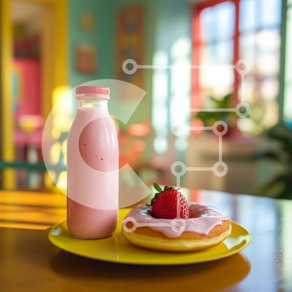 Υπάρχει δυνατότητα προσωποποίησης με δική σας φωτογραφία και προσαρμογής διαστάσεων κατόπιν παραγγελίας. Το συγεκεριμενο puzzle παρουσιαζει Η εικόνα παρουσιάζει ένα υπέροχο σκηνικό πρωινού με ένα μπουκάλι ροζ γάλα και ένα ροζ παγωμένο ντόνατ με μια φρέσκια φράουλα σε ένα φωτεινό κίτρινο πιάτο. Το φόντο είναι ένα ζωντανό και πολύχρωμο δωμάτιο με πράσινους τοίχους και κόκκινα παράθυρα, που δημιουργούν μια χαρούμενη