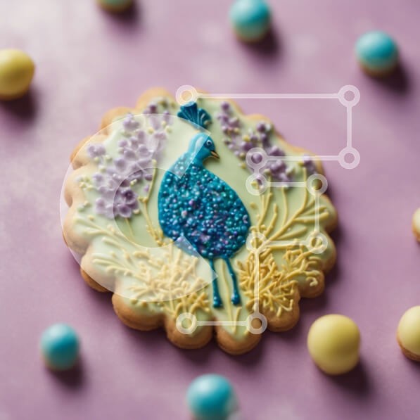 Υπάρχει δυνατότητα προσωποποίησης με δική σας φωτογραφία και προσαρμογής διαστάσεων κατόπιν παραγγελίας. Το συγεκεριμενο puzzle παρουσιαζει Αυτή η εικόνα παρουσιάζει ένα όμορφα διακοσμημένο μπισκότο σε σχήμα παγωνιού με ζωηρά μπλε, μοβ και κίτρινα χρώματα. Το μπισκότο περιβάλλεται από μια ποικιλία από πολύχρωμες καραμέλες, προσθέτοντας στην οπτική του γοητεία. Υπάρχουν επίσης μικρές λευκές μπάλες, που υποδηλώνουν