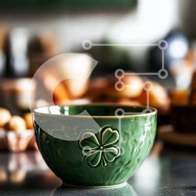 Υπάρχει δυνατότητα προσωποποίησης με δική σας φωτογραφία και προσαρμογής διαστάσεων κατόπιν παραγγελίας. Το συγεκεριμενο puzzle παρουσιαζει Αυτή η εικόνα παρουσιάζει ένα πράσινο κεραμικό μπολ σε περίοπτη θέση σε ένα τραπέζι, στολισμένο με ένα διακοσμητικό έμβλημα τετράφυλλου τριφυλλιού. Το μπολ έχει γυαλιστερό φινίρισμα, αντανακλώντας το ζεστό φως από το περιβάλλον. Στο παρασκήνιο, στοιχεία μαλακής εστίασης υποδηλ