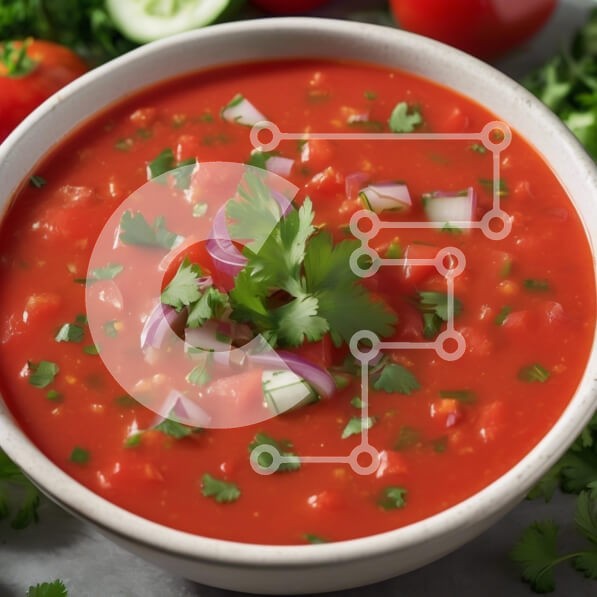 Υπάρχει δυνατότητα προσωποποίησης με δική σας φωτογραφία και προσαρμογής διαστάσεων κατόπιν παραγγελίας. Το συγεκεριμενο puzzle παρουσιαζει Αυτή η εικόνα παρουσιάζει ένα ζωντανό μπολ με σάλτσα ντομάτας, πλούσιο σε χρώμα και υφή. Η σάλτσα γαρνίρεται με φρέσκο κόλιανδρο και κρεμμύδια κομμένα σε κύβους, δημιουργώντας μια δροσερή εμφάνιση. Το φόντο περιλαμβάνει φρέσκες ντομάτες και πράσινα βότανα, ενισχύοντας τη συν