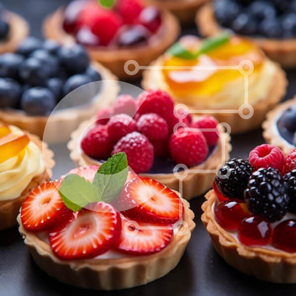 Υπάρχει δυνατότητα προσωποποίησης με δική σας φωτογραφία και προσαρμογής διαστάσεων κατόπιν παραγγελίας. Το συγεκεριμενο puzzle παρουσιαζει Αυτή η εικόνα παρουσιάζει μια ποικιλία από πολύχρωμες τάρτες φρούτων τοποθετημένες τακτοποιημένα σε μια σκοτεινή επιφάνεια. Κάθε τάρτα είναι γεμάτη με κρεμώδη κρέμα και από πάνω μια ποικιλία από φρέσκα φρούτα, όπως φράουλες, σμέουρα, βατόμουρα και βατόμουρα. Οι τάρτες έχουν χρ