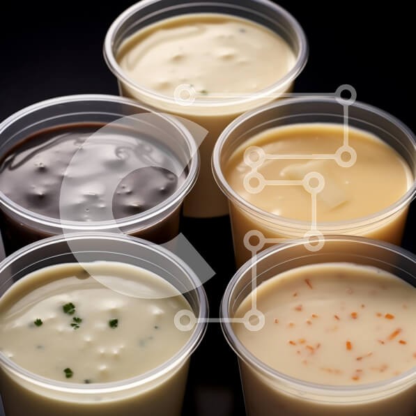 Υπάρχει δυνατότητα προσωποποίησης με δική σας φωτογραφία και προσαρμογής διαστάσεων κατόπιν παραγγελίας. Το συγεκεριμενο puzzle παρουσιαζει Η εικόνα παρουσιάζει έξι πλαστικά κύπελλα γεμάτα με διάφορες σάλτσες και ντιπ, το καθένα με το όνομα της σάλτσας. Οι κούπες είναι διατεταγμένες σε μαύρο φόντο, με γαρνιτούρα μαϊντανού διάσπαρτη γύρω τους. Αυτή η ρύθμιση επιτρέπει την εύκολη αναγνώριση των βυθίσεων και προσφέρε