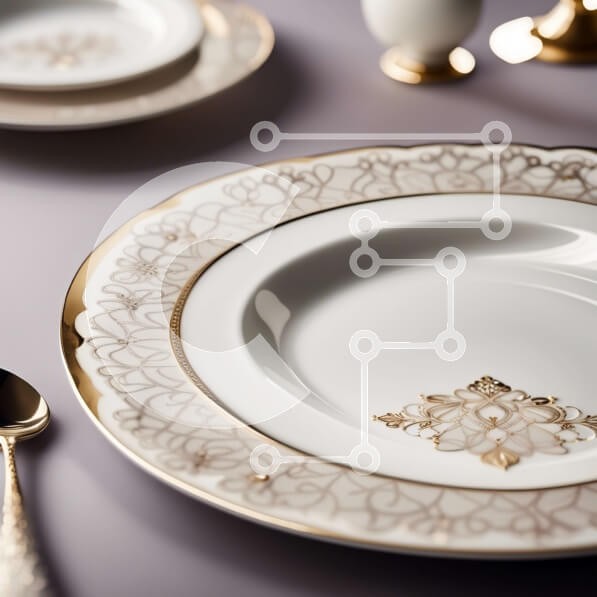 Υπάρχει δυνατότητα προσωποποίησης με δική σας φωτογραφία και προσαρμογής διαστάσεων κατόπιν παραγγελίας. Το συγεκεριμενο puzzle παρουσιαζει Αυτή η εικόνα είναι ένα κοντινό πλάνο ενός τραπεζιού με ένα λευκό πιάτο με χρυσό σχέδιο λουλουδιών, ένα γυαλί με χρυσό πλαίσιο και ασημικά με χρυσές λαβές. Το φόντο είναι ανοιχτό γκρι. Ο κομψός και εκλεπτυσμένος σχεδιασμός είναι ιδανικός για να επιδείξετε εξαιρετικό φαγητό ή ε