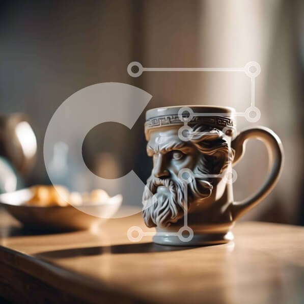 Υπάρχει δυνατότητα προσωποποίησης με δική σας φωτογραφία και προσαρμογής διαστάσεων κατόπιν παραγγελίας. Το συγεκεριμενο puzzle παρουσιαζει Η εικόνα δείχνει μια κούπα καφέ με το πρόσωπο ενός αρχαίου Έλληνα θεού, συνοδευόμενη από ένα μπολ με μπισκότα και διάφορα φρούτα όπως μήλα και σταφύλια σε ένα ξύλινο τραπέζι. Ένα μοναδικό puzzle που συνδυάζει ποιότητα, αισθητική και εμπειρία. Υλικό: Κατασκευασμένο από ανθεκτ
