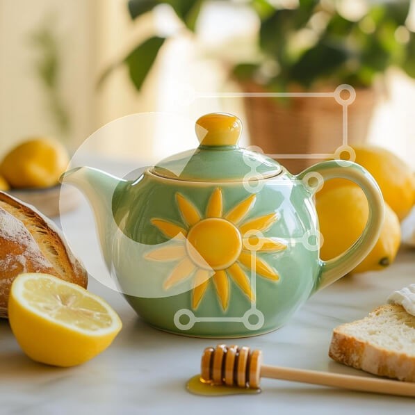 Υπάρχει δυνατότητα προσωποποίησης με δική σας φωτογραφία και προσαρμογής διαστάσεων κατόπιν παραγγελίας. Το συγεκεριμενο puzzle παρουσιαζει Αυτή η εικόνα παρουσιάζει μια γοητευτική πράσινη τσαγιέρα στολισμένη με ένα λαμπερό σχέδιο ηλίανθου, τοποθετημένη σε μαρμάρινη επιφάνεια. Δίπλα στην τσαγιέρα, υπάρχει ένα μισό λεμόνι και μια φέτα ψωμί, ενώ μια ξύλινη μελιτωμένη κουκούλα βρίσκεται κοντά, περιχυμένη με μέλι. Το