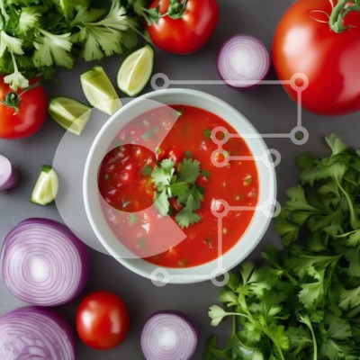 Υπάρχει δυνατότητα προσωποποίησης με δική σας φωτογραφία και προσαρμογής διαστάσεων κατόπιν παραγγελίας. Το συγεκεριμενο puzzle παρουσιαζει Αυτή η εικόνα παρουσιάζει ένα ζωντανό μπολ με σούπα ντομάτας γαρνιρισμένο με φρέσκο κόλιανδρο, που περιβάλλεται από μια ποικιλία από φρέσκα υλικά. Ζουμερές κόκκινες ντομάτες, μοβ κρεμμύδια και πράσινα λάιμ είναι περίτεχνα διατεταγμένα γύρω από το μπολ, δημιουργώντας ένα πολύ
