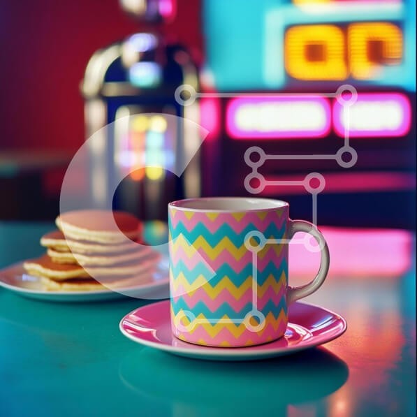 Υπάρχει δυνατότητα προσωποποίησης με δική σας φωτογραφία και προσαρμογής διαστάσεων κατόπιν παραγγελίας. Το συγεκεριμενο puzzle παρουσιαζει Η εικόνα παρουσιάζει μια πολύχρωμη κούπα με σχέδια γεμάτη με ένα ζεστό ρόφημα, τοποθετημένη σε ένα ροζ πιάτο δίπλα σε μια στοίβα από αφράτες τηγανίτες. Το φόντο δείχνει ένα ζωντανό ρετρό τζουκ μποξ με λαμπερά φώτα, που ενισχύουν τη χαρούμενη και φιλόξενη ατμόσφαιρα. Η γαλαζοπρ