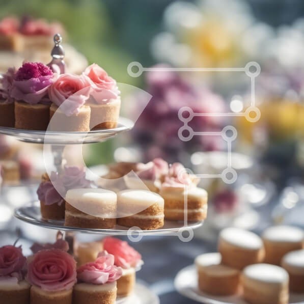 Υπάρχει δυνατότητα προσωποποίησης με δική σας φωτογραφία και προσαρμογής διαστάσεων κατόπιν παραγγελίας. Το συγεκεριμενο puzzle παρουσιαζει Αυτή η εικόνα παρουσιάζει μια πολυεπίπεδη βάση για κέικ στολισμένη με πολλά μικρά κέικ. Τα κέικ είναι όμορφα διακοσμημένα με ροζ τριαντάφυλλα και λευκό γλάσο. Το τραπέζι είναι επίσης στρωμένο με πιάτα και ασημικά. Το φόντο διαθέτει πράσινο γκαζόν με δέντρα και γαλάζιο ουρανό.